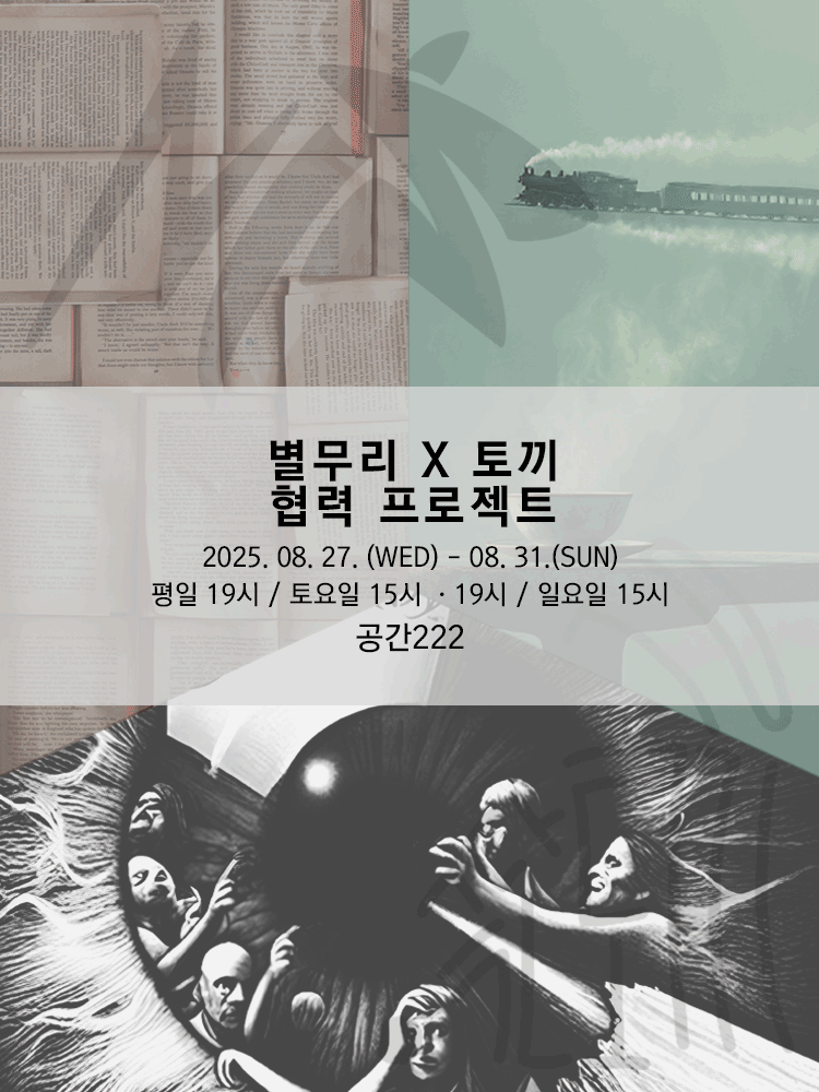 | PF272138 | 별무리 X 토끼 협력프로젝트, 극야 / 기차마을 찻집 / 하얀일기 | 2025.08.27 | 2025.08.31 | ![]() | 연극 | △ |